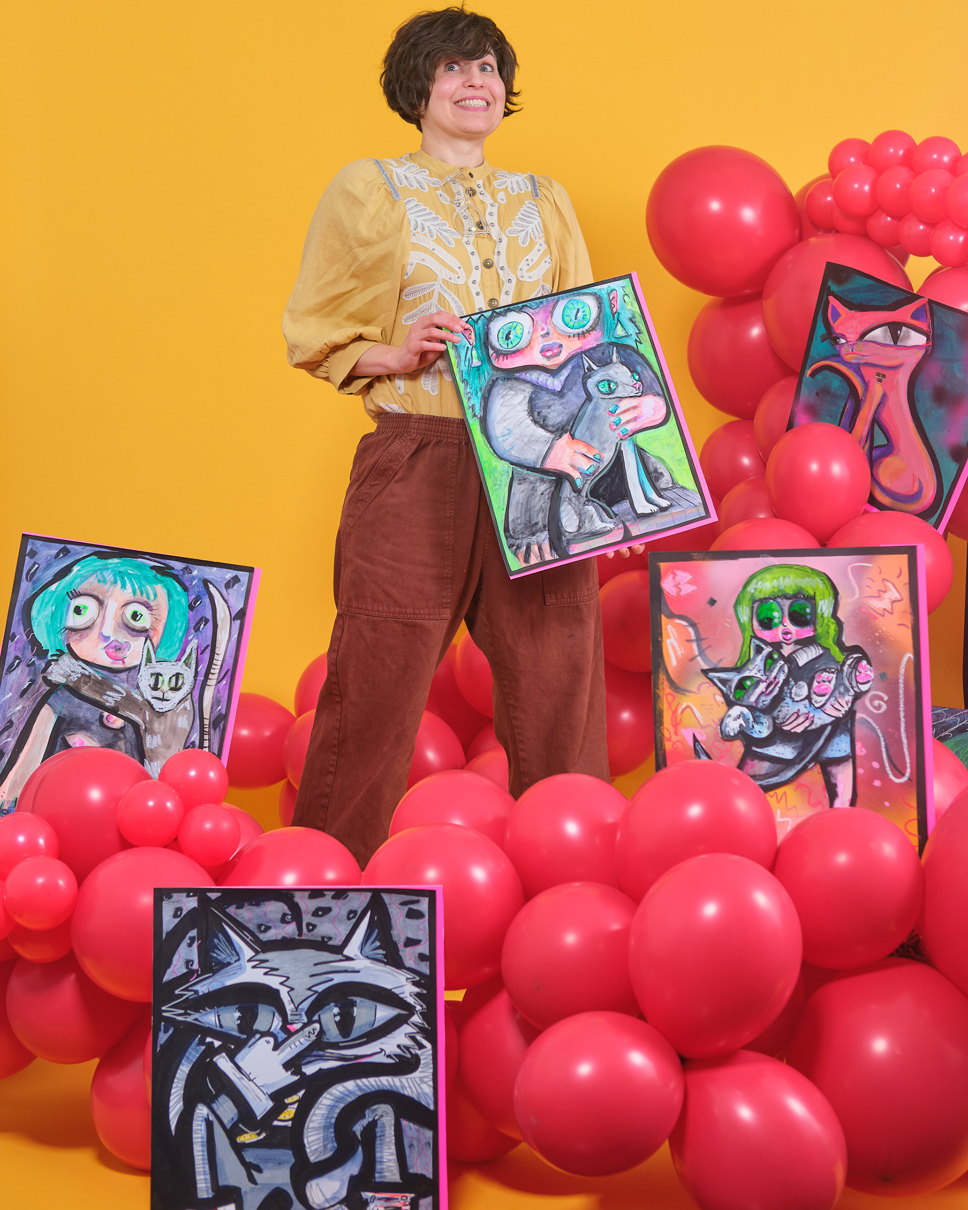 Lindsay Kovnat is a Philadelphia-based interdisciplinary artist working in painting, sculpture, and animation. Her work explores vulnerability, humor, and transformation through surreal characters that blend human, animal, and mythic forms. Drawing from animation, underground comics, and feminist art traditions, Kovnat creates luminous, mischievous worlds where emotional intensity and absurdity coexist.