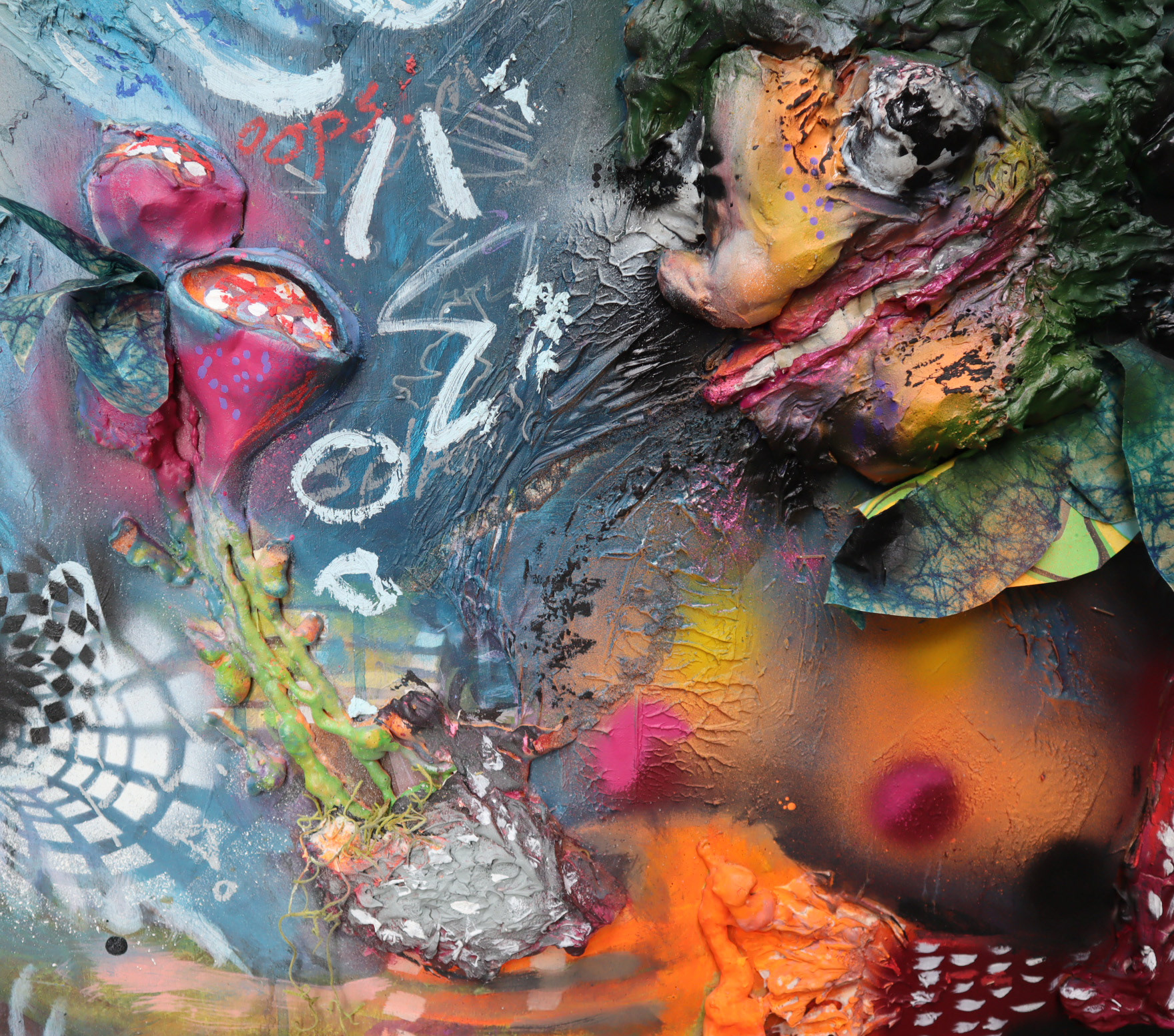 Oil and acrylic paint, spray foam, modling paste, oil stick on board