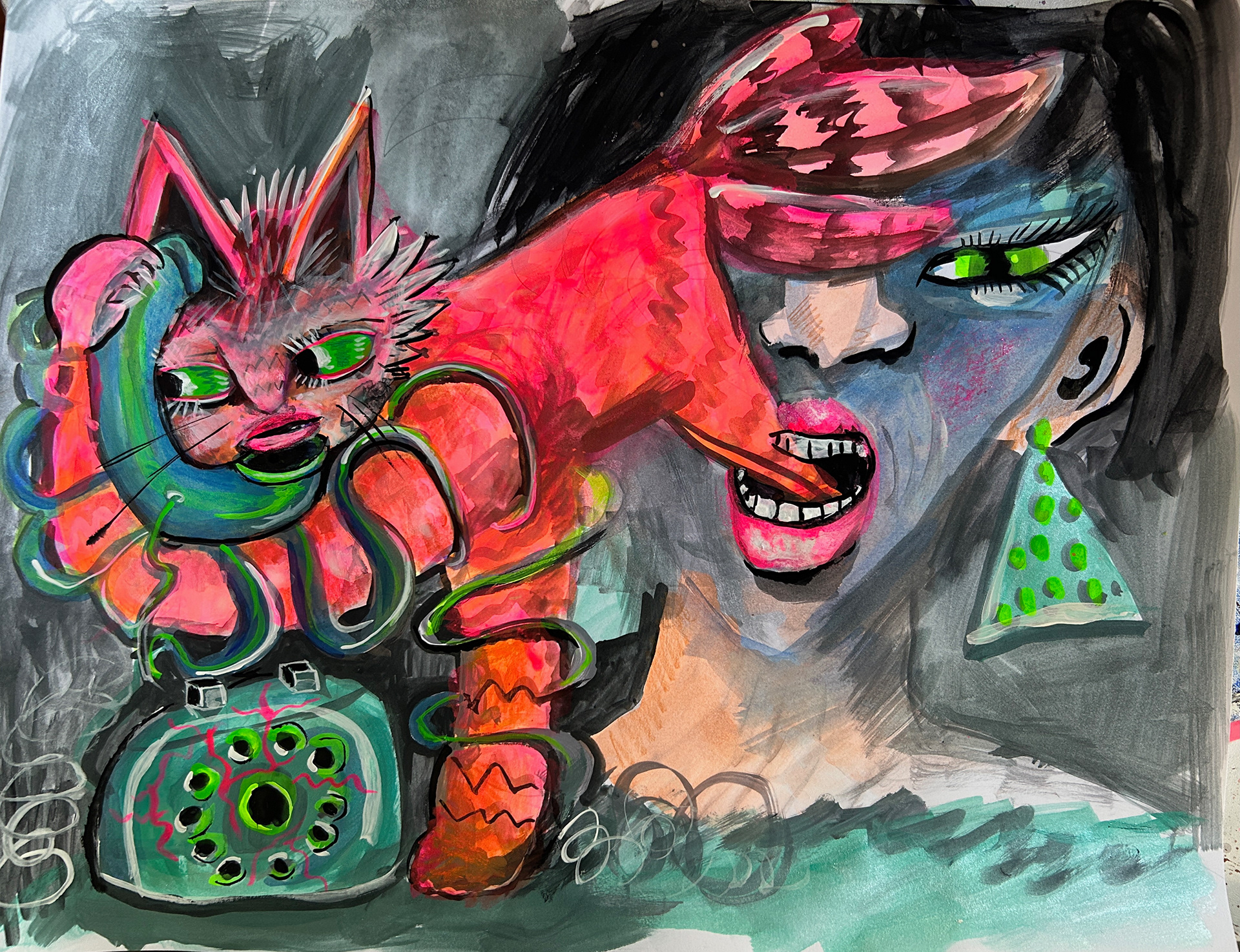 Depictions of cats and women with mixed media, spray paint, clay, acrylic on canvas and board
