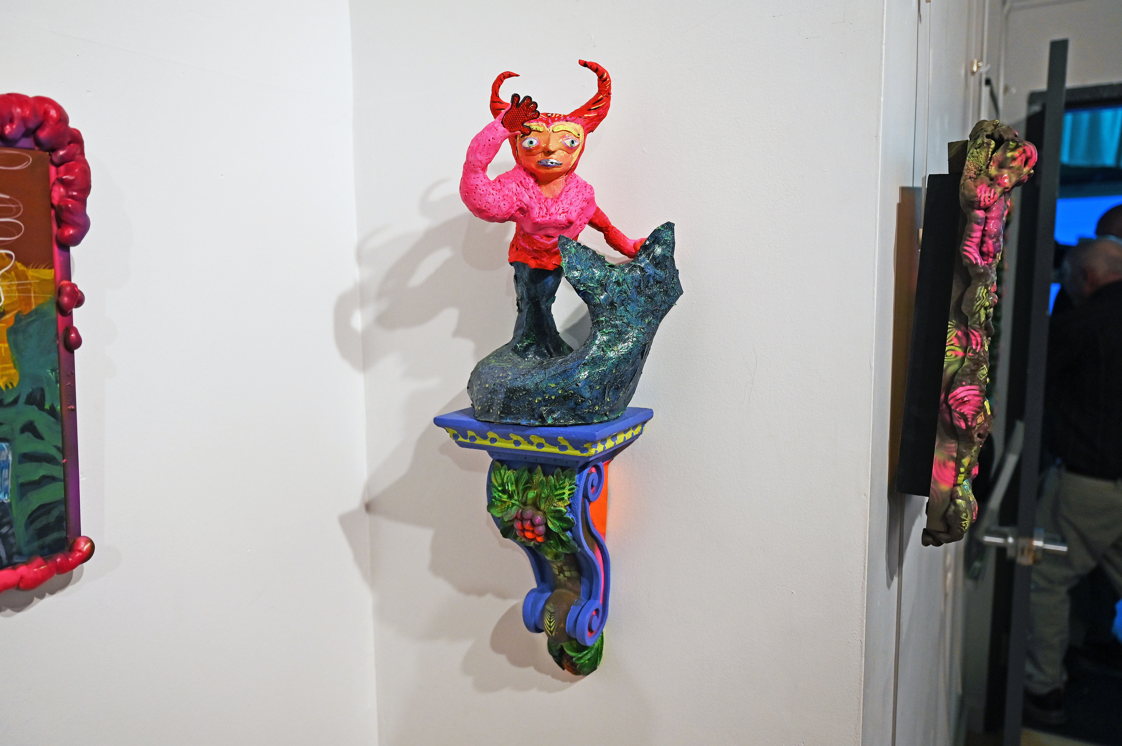 A series of 10-12 surreal oil and acrylic paintings, with bright and day glow colors adorned with handcrafted 3D frames, accompanied by spiritual garden statue like sculptures.