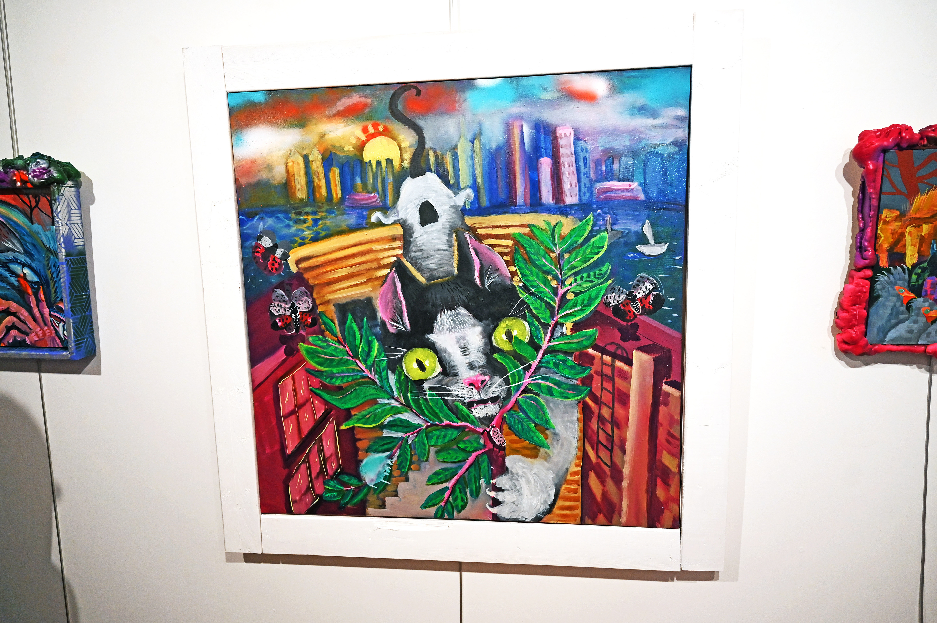 During endless walks she was influenced by the little spirit guides found on people’s front yards like garden nomes, lions and buddhas. Lion sculptures influenced the “Cyber Security Cat” painting which illustrates a cat as security guard protecting the party from Twitter trolls with a mouse trying to get away. Or another series of paintings based her cat falling off the roof and almost dying. Her cats became central as she became very in tune with them. The culmination in the cat jumping off the roof as the last painting shows how far she’s come from dancing with other humans to seeing cats as all encompassing.